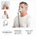 - InfinitySeal™ cushion adapts to nearly all facial features and pressure settings - Plush, stable headgear with magnetic clips for easy on/off - Quick-release elbow allows disconnecting tubing without removing the mask - Open-visibility design with no forehead bar for comfort and freedom - QuietAir™ vent reduces sound and creates a peaceful sleep environment - In the box: Headgear, Frame, Cushion, 2 Magnetic Clips, Swivel/Elbow