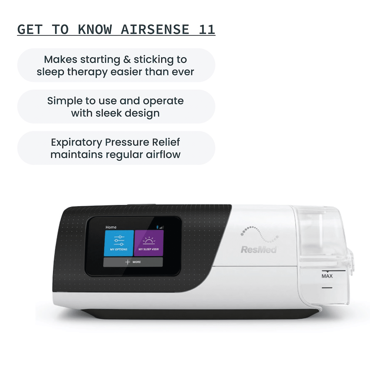 Request This ProductThe ResMed AirSense™ 11 CPAP and APAP series combines advanced digital health features with proven therapy modes to make sleep apnea treatment more comfortable and easier to follow. With built-in access to myAir™, plus exclusive tools like Personal Therapy Assistant and Care Check-In, the AirSense 11 guides you through setup, troubleshooting, and therapy success. Designed with a sleek modern look, intuitive touchscreen, and integrated heated humidifier, the AirSense 11 is a powerful step forward in CPAP therapy—helping you start strong and stay on track.