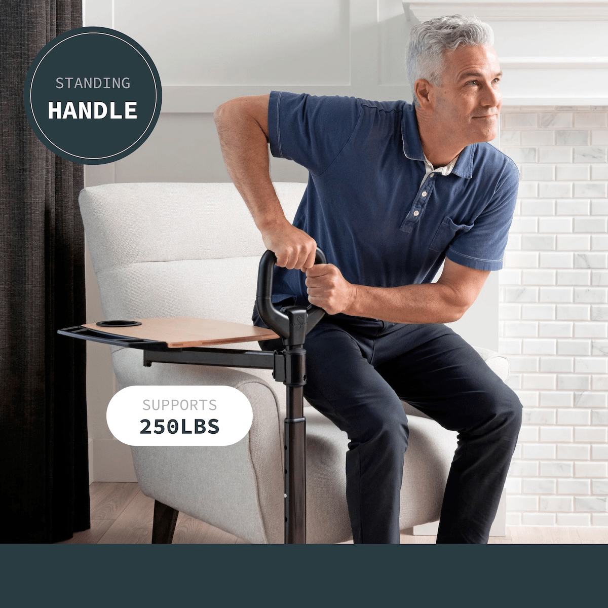 Sturdy grip adjusts 34”–40” to assist with sitting and standing.360° Swivel Tray