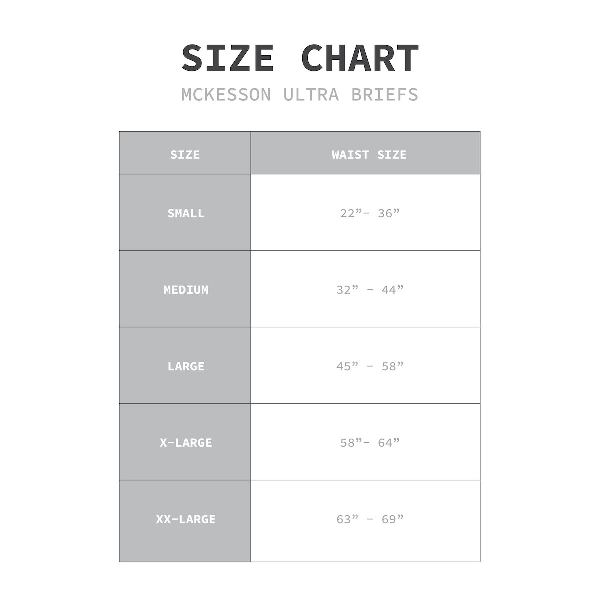 - Small: 22"–36" waist - Medium: 32"–44" waist - Large: 45"–58" waist - X-Large: 59"–64" waist - XX-Large: 63"–69" waistAbsorbency