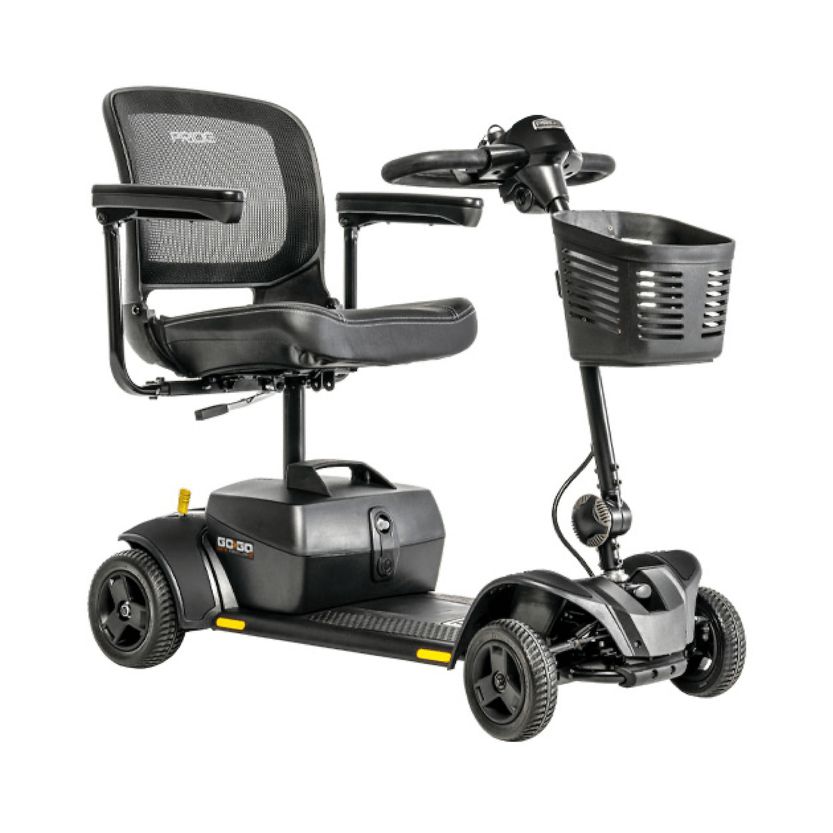 Request This ProductThe Go Go Elite Traveller® 2 4-Wheel is the first scooter of its kind to combine 4-wheel stability with 3-wheel maneuverability, thanks to Pride’s patented EZ Turn Technology. With the industry’s smallest turning radius for a 4-wheel scooter at just 37”, it provides superior navigation indoors and out. Feather-touch disassembly makes storage and transport simple, while removable color-through shrouds let you customize your style. With a 300-lb. weight capacity, speeds up to 4.23 mph, and up to 13.8 miles per charge, this scooter is designed for independence, portability, and fun.