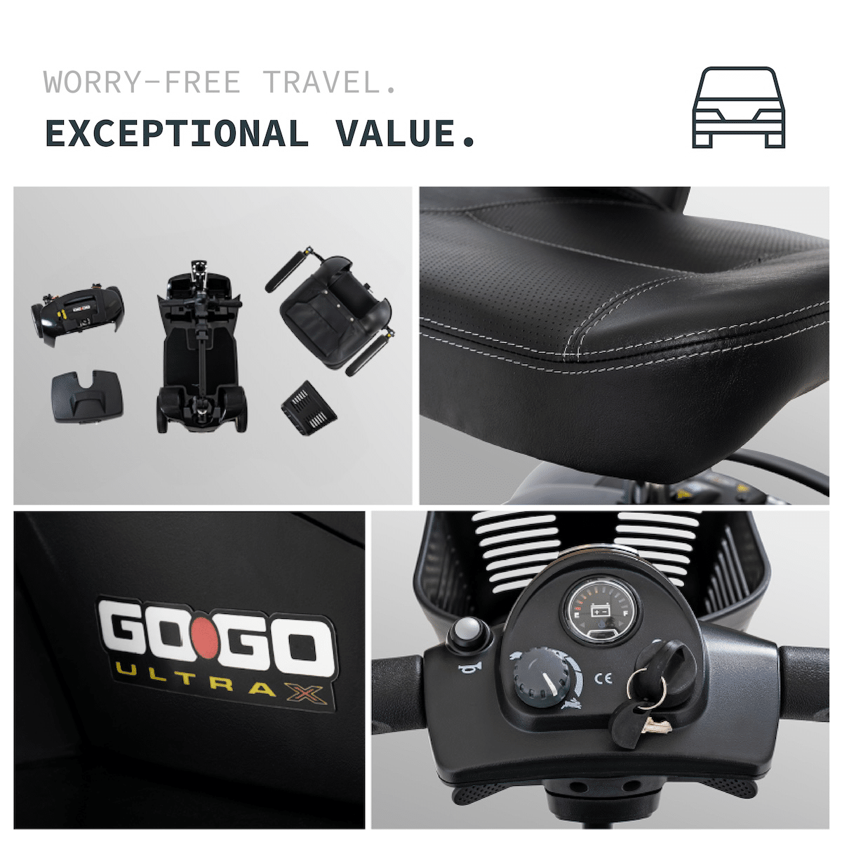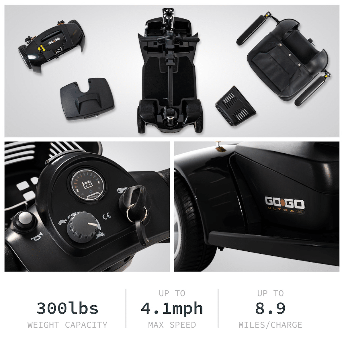 Request This ProductThe Go Go® Ultra X 4-Wheel Scooter combines value, convenience, and performance in one affordable package. With feather-touch disassembly, a compact foldable seat, and a simple drop-in battery box, it’s designed for easy transport and worry-free travel. This economy-class scooter doesn’t compromise on quality, offering speeds up to 4.1 mph, a driving range of up to 8.9 miles, and a 300 lb. weight capacity. Backed by Pride Mobility’s trusted design and reliability, the Ultra X 4-Wheel is perfect for everyday outings, errands, and leisure rides with comfort and stability.
