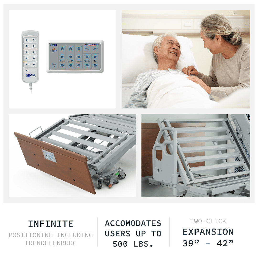 The Span America Advantage Bed is a premium full-electric hospital bed designed for clinical-quality positioning, comfort, and safety in the home. Featuring advanced smart technology and versatile adjustment options, this bed provides superior support, mobility at any height, and customizable configurations to meet a wide range of care needs. Ideal for long-term care, rehabilitation, recovery, and home healthcare environments.