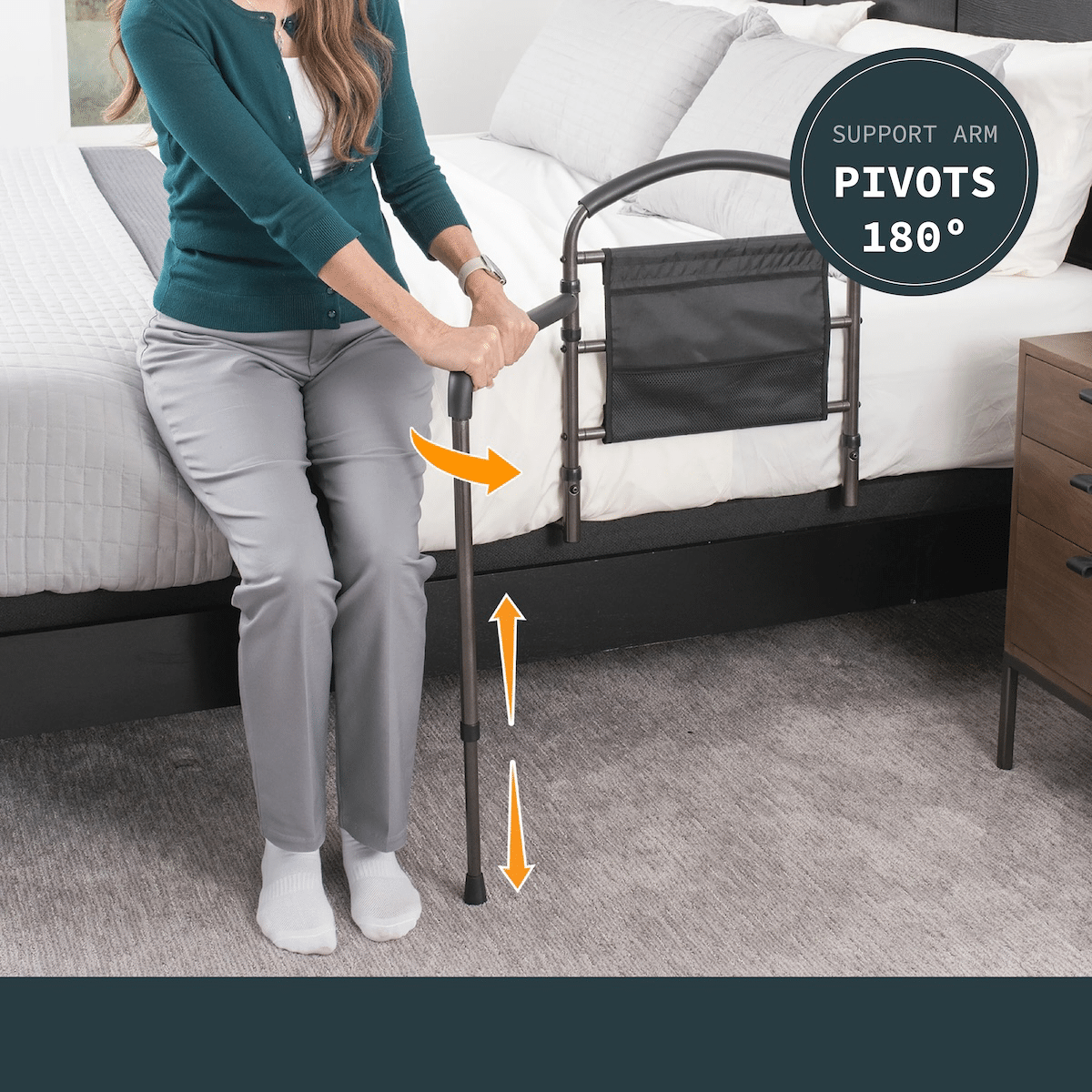Comfortable grip assists with safe transfers in and out of bed.Swing-Out Arm