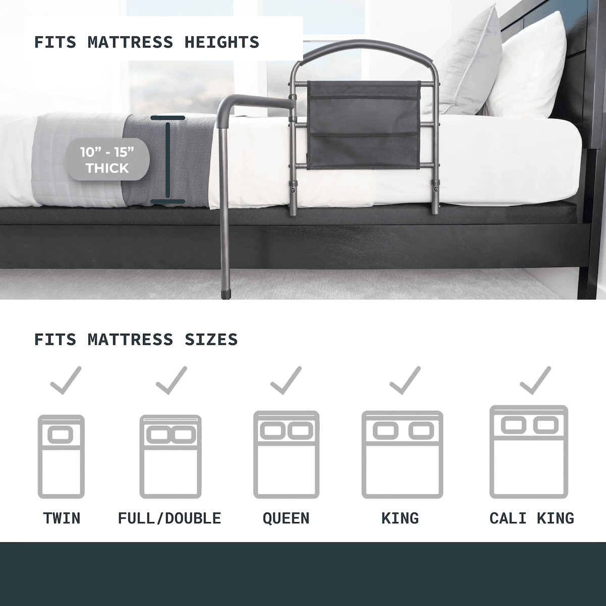 Fits mattress heights between 10″–15″.